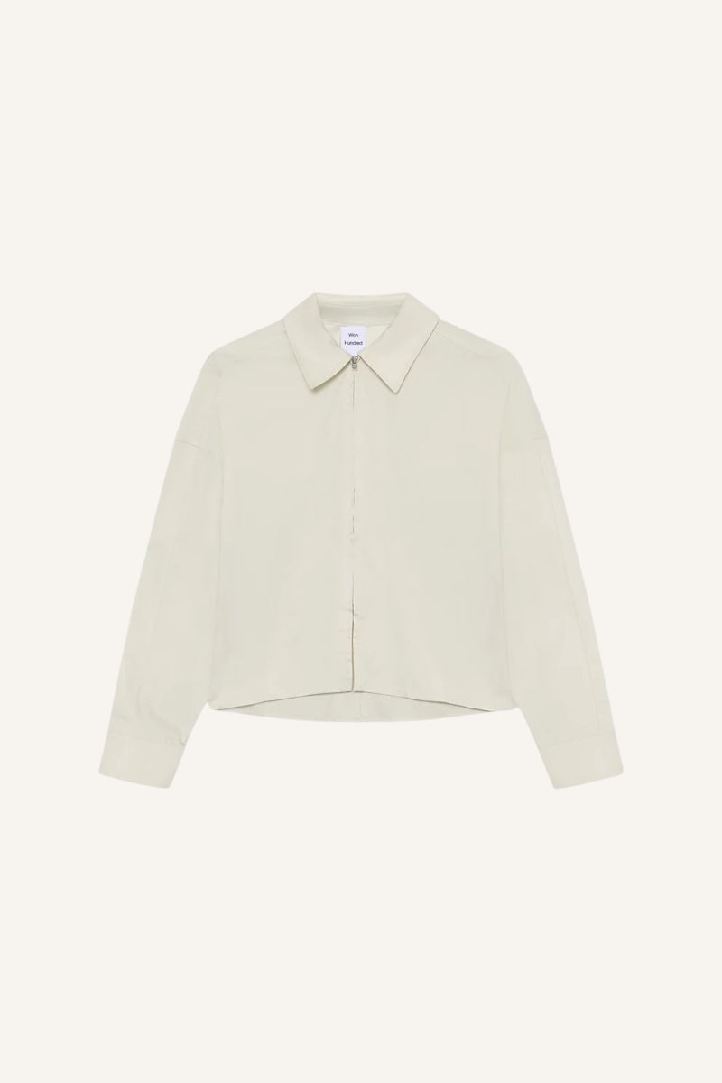 Gia Shirt is crafted in a modern oversized silhouette, gently defined at the waist to create a flattering and balanced shape. The design features a sleek front zipper closure and high cuffs with concealed snap buttons, offering a refined and structured finish.