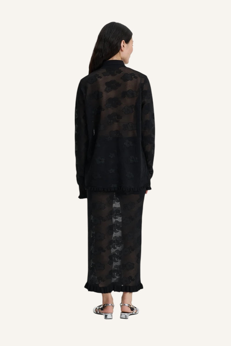 Soft and feminine, the Petra cardigan from Cecilie Bahnsen is made from floral jacquard knit. It features a classic shirt collar and ruffled hem and cuffs. One of our absolute favorites at Damernes Magasin.