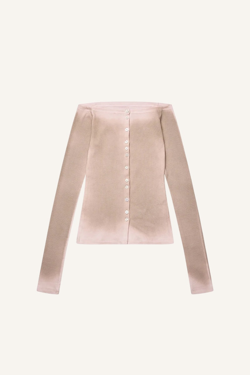 KerneMilk Mathilda cardigan is fitted with off shoulder cutand front botton details.